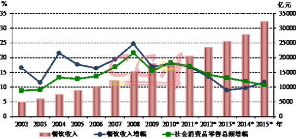 图1 全国餐饮收入及增速状况(2002~2015年)