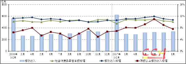 根据9月14日国家统计局最新发布的数据,2017年8月,全国餐饮收入3360亿元,同比增长10.7%;限额以上单位餐饮收入829亿元,同比增长7.6%。2017年1-8月,全国餐饮收入25110亿元,同比增长11.1%;限额以上单位餐饮收入6171亿元,同比增长8.4%。