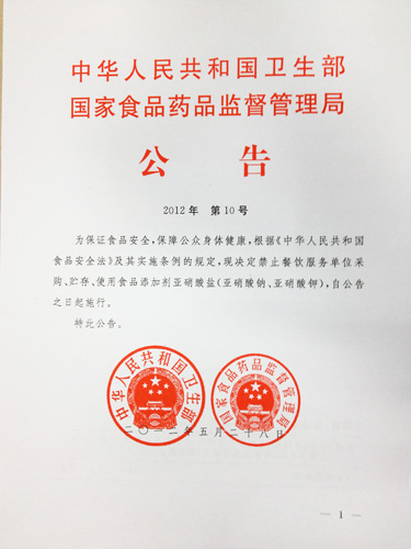 根据国家食品药品监管局、卫生部2012年第10号公告,为保证食品安全,保障公众身体健康,根据《中华人民共和国食品安全法》及其实施条例的规定,现决定禁止餐饮服务单位采购、贮存、使用食品添加剂亚硝酸盐(亚硝酸钠、亚硝酸钾),自公告之日起施行。